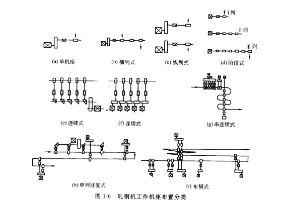 軋制比較復(fù)雜的斷面(角鋼,槽鋼等),因此連軋機(jī)調(diào)整復(fù)雜,通常采用半連續(xù)式(見(jiàn)圖1-6g),它是由兩個(gè)機(jī)座組成,其中一組布置成連續(xù)式(粗軋機(jī)組),另一組布置成橫列式精軋機(jī)組或階段式。