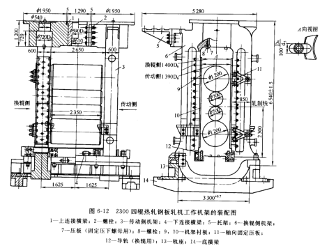 圖 6-12 所示為 2300四輾熱軋鋼板軋機(jī)工作機(jī)架的裝配圖。它是由左右兩閉口式機(jī)架3、6,一個(gè)具有上支承輾平衡液壓缸孔的上連接橫梁1,兩個(gè)下連接橫梁 4,兩個(gè)放壓下傳動(dòng)裝置的托架 5及兩個(gè)軌座 13等主要零件所組成。