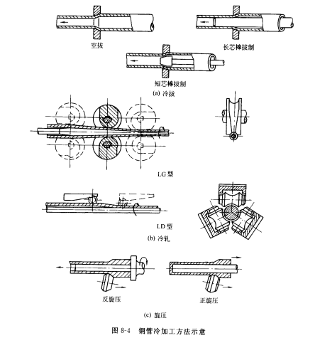 鋼管冷加工方法有冷軋、冷拔和旋壓等三種(見圖 8-4)。旋壓本質(zhì)上也是一種冷軋,冷軋管機(jī)和旋壓機(jī)的規(guī)格大小用其軋制的產(chǎn)品規(guī)格 (較大外徑) 和軋管機(jī)型式來表示。 例如,LG-150表示軋管機(jī)的型式為二輥周期式冷軋管機(jī),軋制鋼管的較大外徑為卵150mm。LD-30表示為多輥式冷軋管機(jī),軋制鋼管較大外徑為 中30mm。冷拔機(jī)的規(guī)格用其允許的額定拔制力大小和冷拔機(jī)的傳動方式來表示,例如,LB-20表示為額定拔制力20t 的鏈?zhǔn)嚼浒螜C(jī);80t 液壓冷拔機(jī)表示額定拔制力為80t,采用液壓傳動。